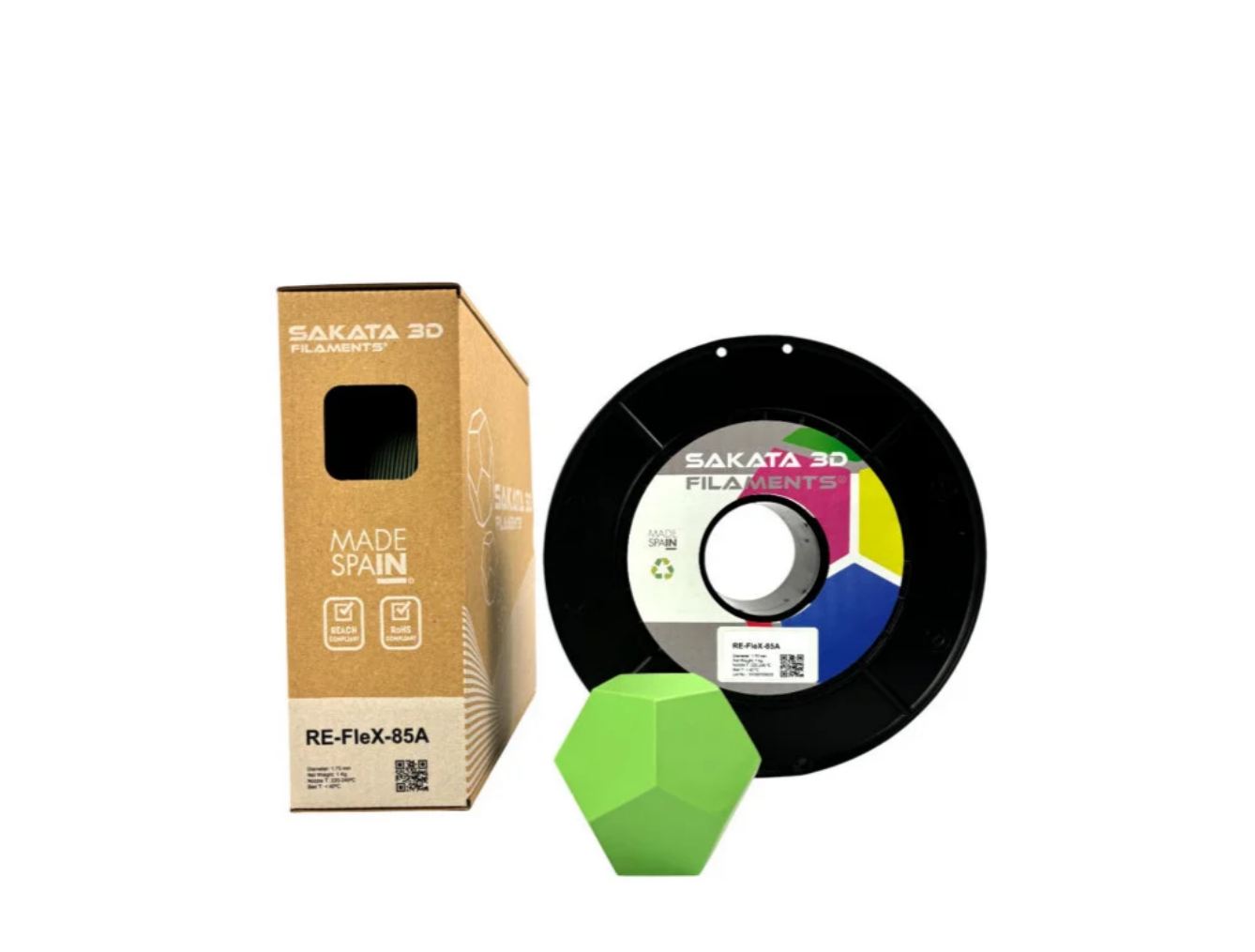O Re-Flex-85 A é um material flexível, 100% reciclado e biodegradável. Desenvolvido exclusivamente pela Sakata 3D Filaments. Pertence à família de materiais flexíveis da Sakata 3D Filaments, que são uma excelente alternativa ao TPU e ao TPE devido às suas propriedades elásticas, além de oferecerem a facilidade de impressão de um PLA. Possui uma dureza Shore de 85 A, que pode variar em 3 pontos +/- devido à sua composição de material genuinamente reciclado.