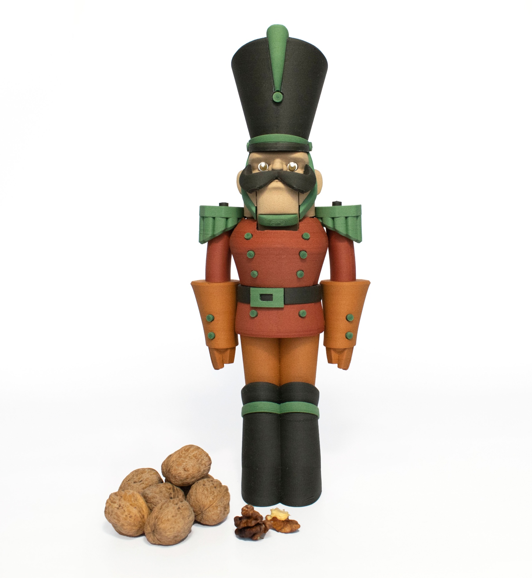 • Boneco soldado de madeira e nozes em fundo branco